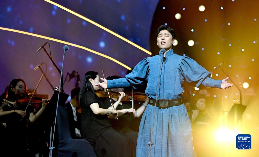 7月8日,在西安“感悟初心?與黨同行”經典歌曲交響音樂會現場,演唱者傲日其愣在演唱歌曲《天邊》。
