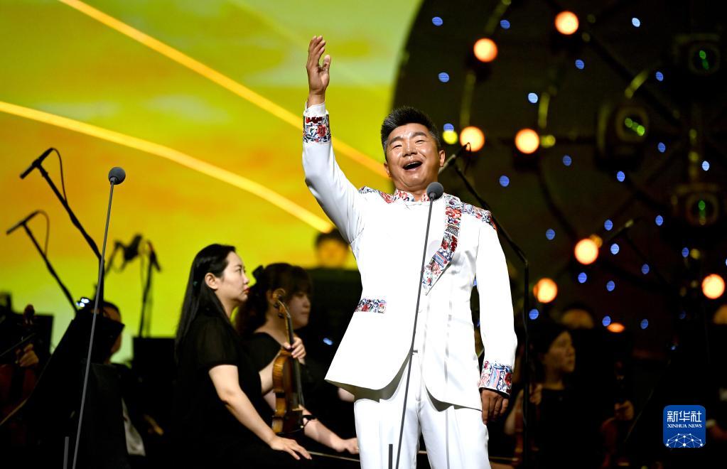 7月8日,在西安“感悟初心?與黨同行”經(jīng)典歌曲交響音樂(lè)會(huì)現(xiàn)場(chǎng),演唱者杜朋朋在演唱歌曲《黃河船夫曲》。