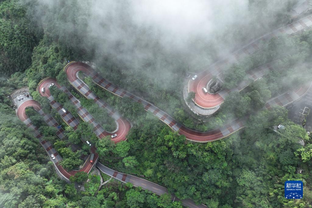 7月8日,雨過天晴后的湖南省湘西土家族苗族自治州吉首市矮寨特大懸索橋和矮寨盤山公路云霧繚繞,景色秀美。