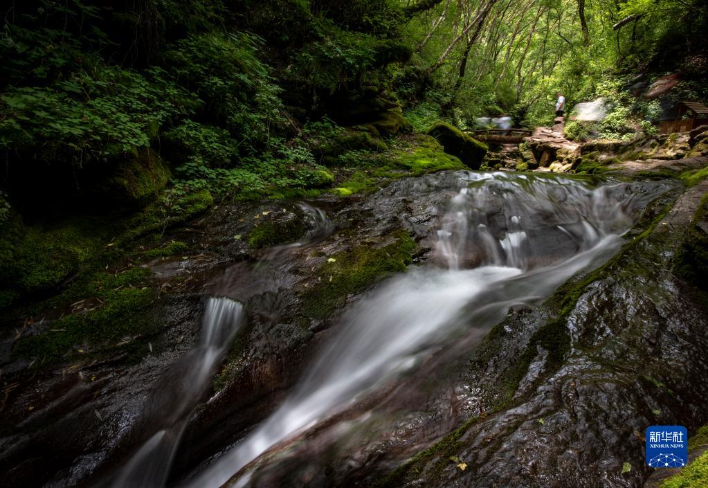 7月8日,游客徒步經(jīng)過六盤山國家森林公園內(nèi)一處溪流。