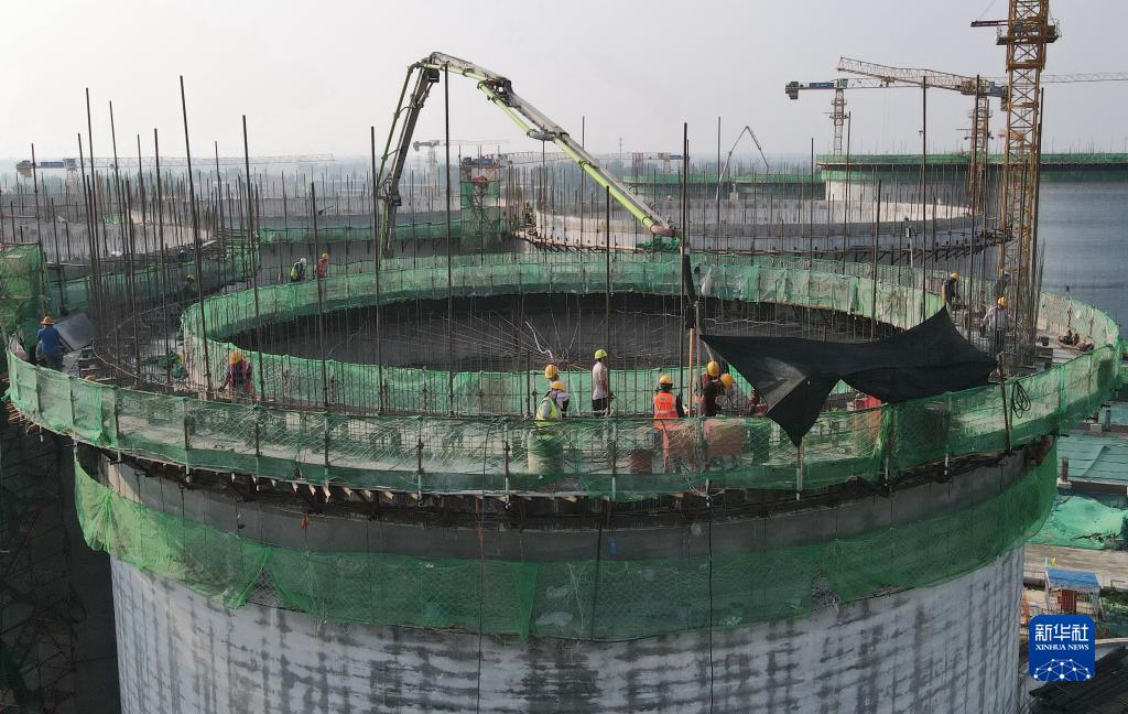 7月8日,工人在糧食安全應急儲備及食品深加工全鏈化綜合生產基地項目建設工地施工(無人機照片)。