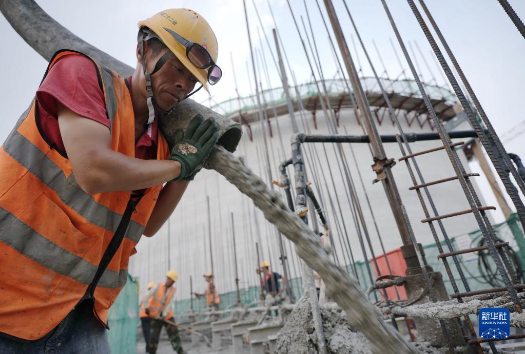 7月8日,工人在糧食安全應急儲備及食品深加工全鏈化綜合生產基地項目建設工地施工。