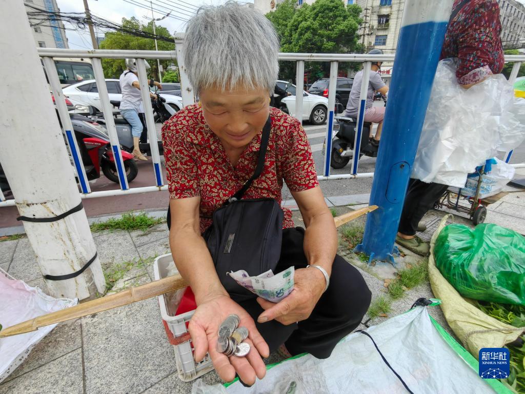 在江西南昌縣城區某菜市場附近,菜農余春蘭在點算今天的收益(7月5日攝)。