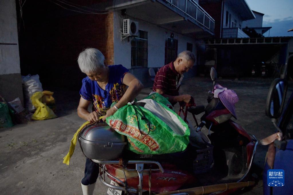 凌晨5時(shí),在江西南昌縣向塘鎮(zhèn)浹溪村,菜農(nóng)余春蘭(左)將整理好的蔬菜固定在摩托車上準(zhǔn)備騎車去趕公交車(7月5日攝)。