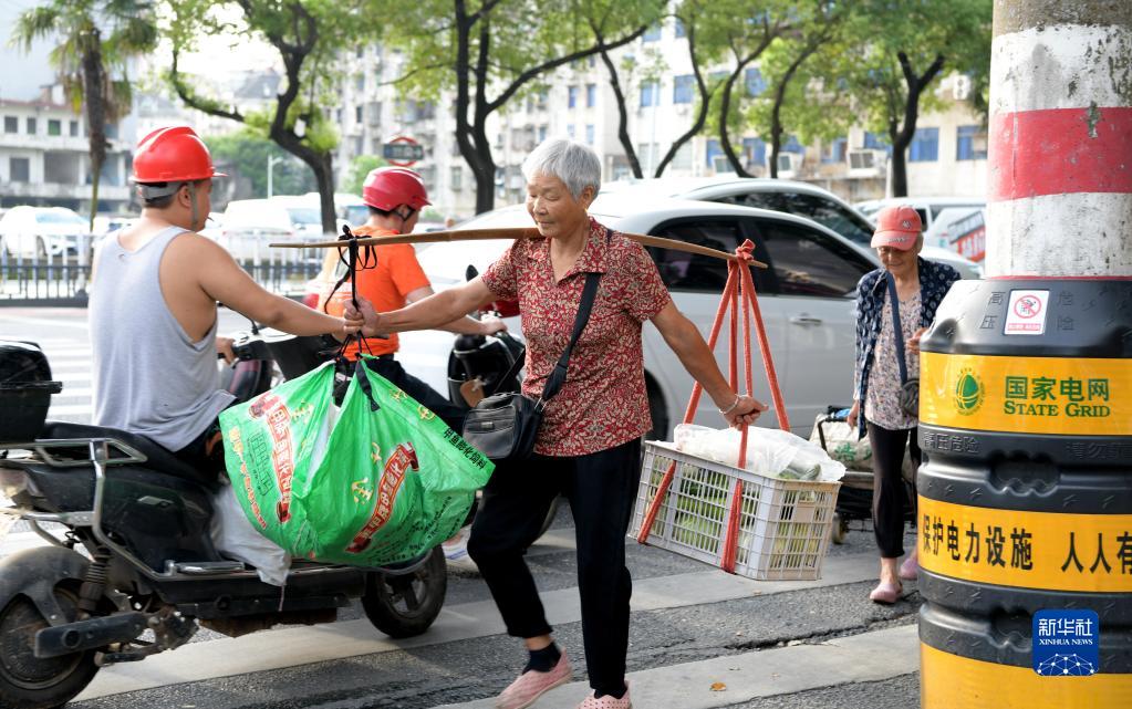 菜農(nóng)余春蘭擔(dān)著菜筐、包裹趕往擺攤點(diǎn)準(zhǔn)備賣菜(7月5日攝)。