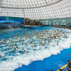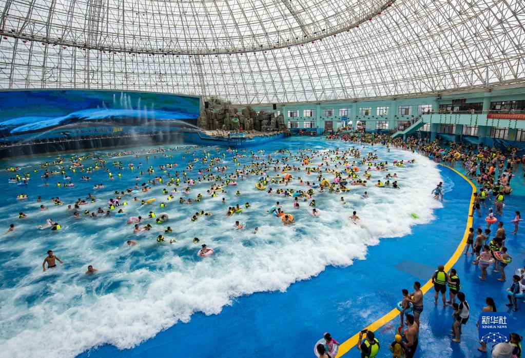 7月8日,游客在安徽省蕪湖市南陵縣大浦鄉村世界的海嘯館戲水游玩。
