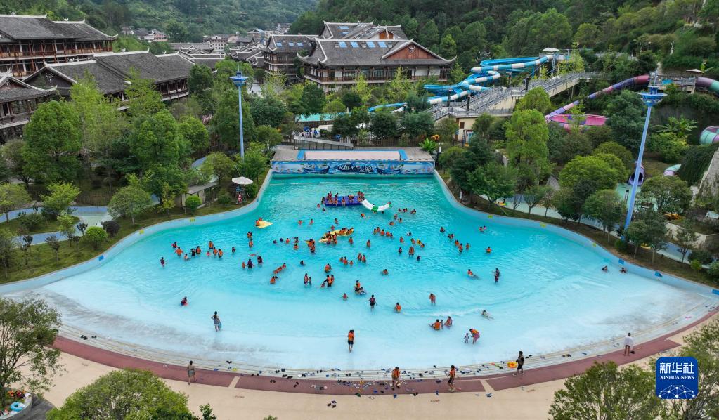7月8日,在貴州省劍河縣溫泉小鎮,游客在戲水消暑(無人機照片)。
