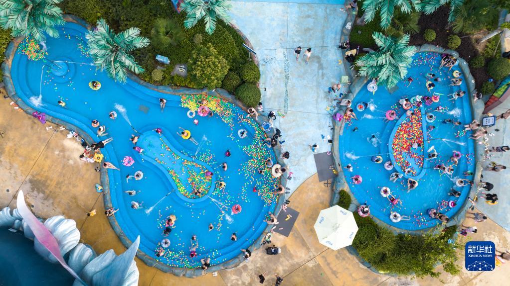 7月8日,游人在湖北省襄陽市華僑城奇夢海灘水樂園游玩(無人機(jī)照片)。