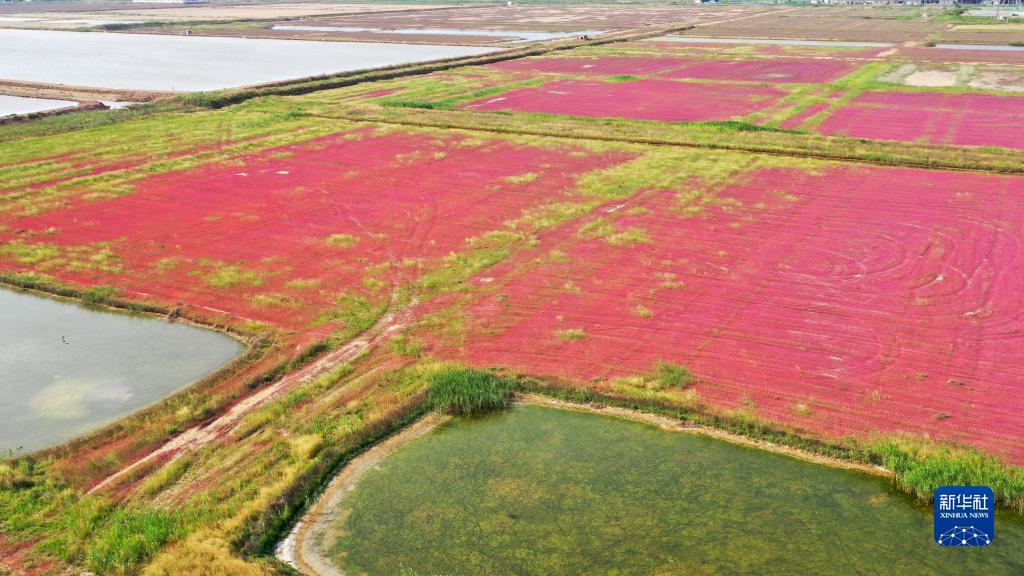 盛夏時節,江蘇省連云港市灌云縣燕尾港沿海灘涂濕地大片野生鹽蒿漸紅,如一片片紅毯鋪在大地上。