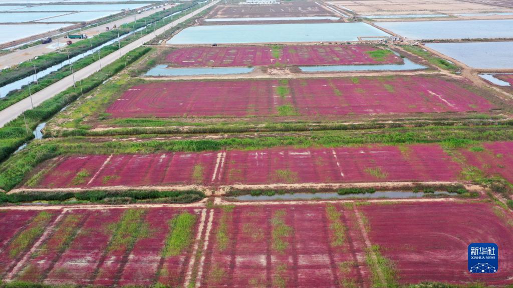 盛夏時(shí)節(jié),江蘇省連云港市灌云縣燕尾港沿海灘涂濕地大片野生鹽蒿漸紅,如一片片紅毯鋪在大地上。