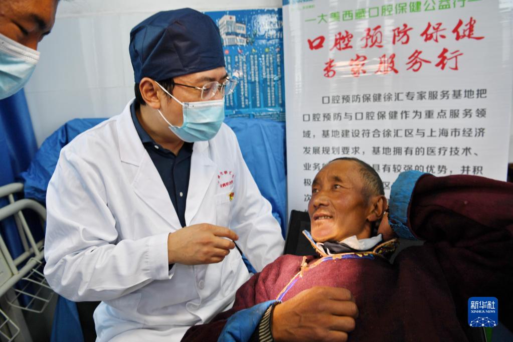 近日,上海市徐匯區牙病防治所的醫務工作者來到西藏浪卡子縣普瑪江塘鄉,為當地居民普及口腔保健知識并進行義診服務。普瑪江塘鄉海拔5373米,是我國海拔最高的鄉。