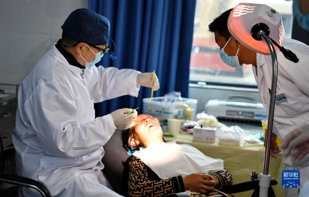 近日,上海市徐匯區牙病防治所的醫務工作者來到西藏浪卡子縣普瑪江塘鄉,為當地居民普及口腔保健知識并進行義診服務。普瑪江塘鄉海拔5373米,是我國海拔最高的鄉。