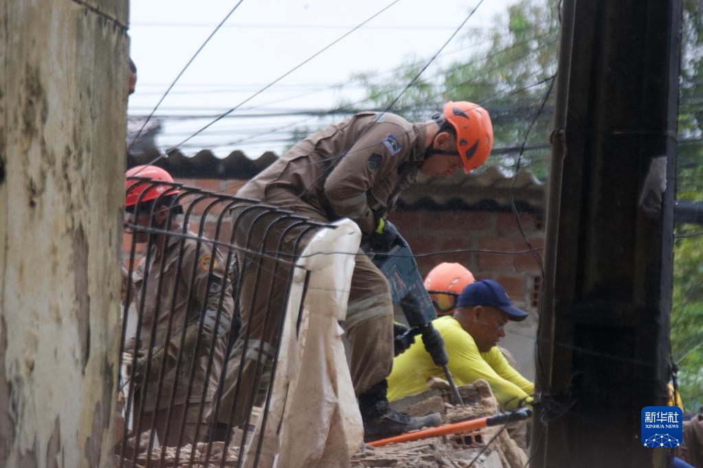 7月7日,救援人員在巴西伯南布哥州累西腓的建筑坍塌現場工作。