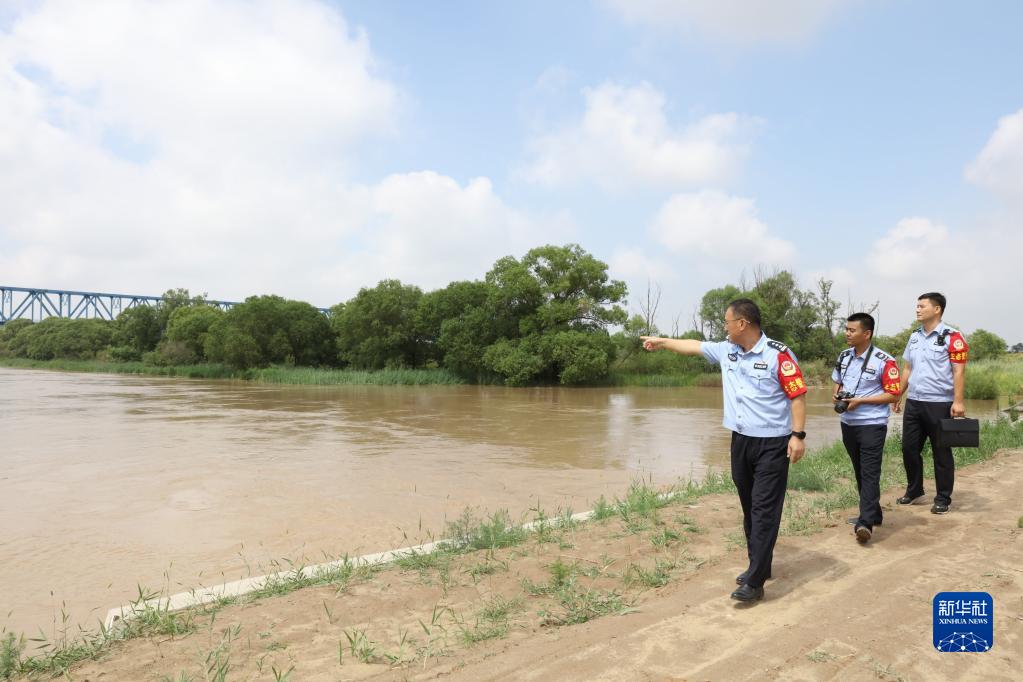 黃河派出所和黃河河務(wù)局水政監(jiān)察大隊(duì)工作人員對(duì)刁口河生態(tài)補(bǔ)水進(jìn)行巡查(2023年6月29日攝)。