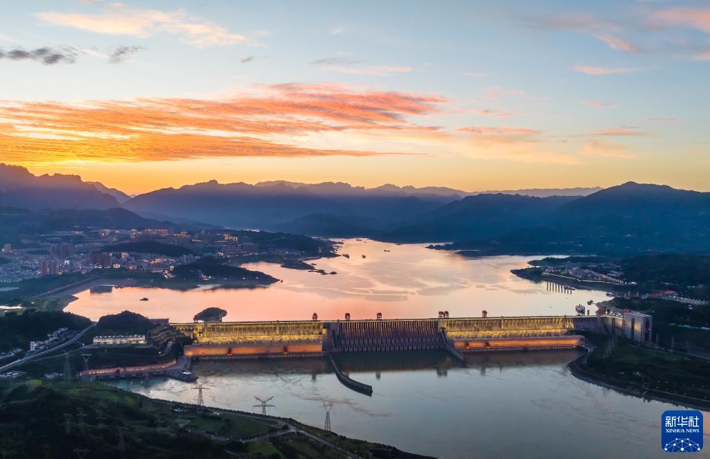 7月4日在湖北省宜昌市拍攝的夕陽映照下的三峽水利樞紐工程(無人機照片)。