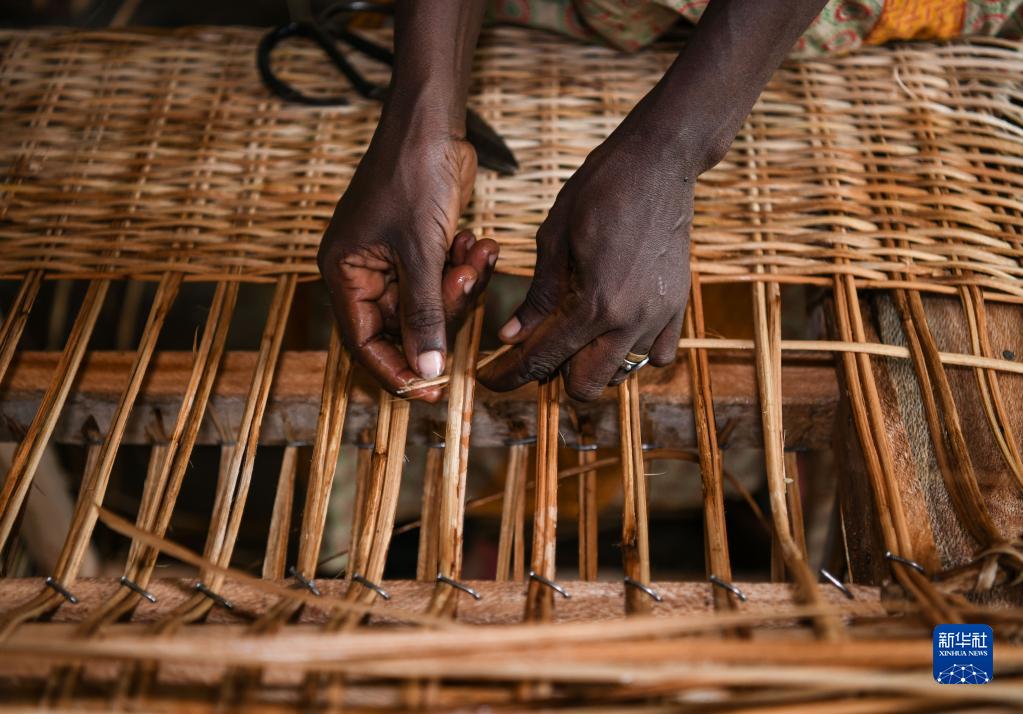 6月21日,在位于布隆迪經濟首都布瓊布拉的卡蒙蓋手工業培訓中心,學員在生產車間制作藤編產品。