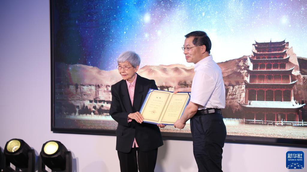 7月10日,樊錦詩(左)領取“樊錦詩星”命名證書。