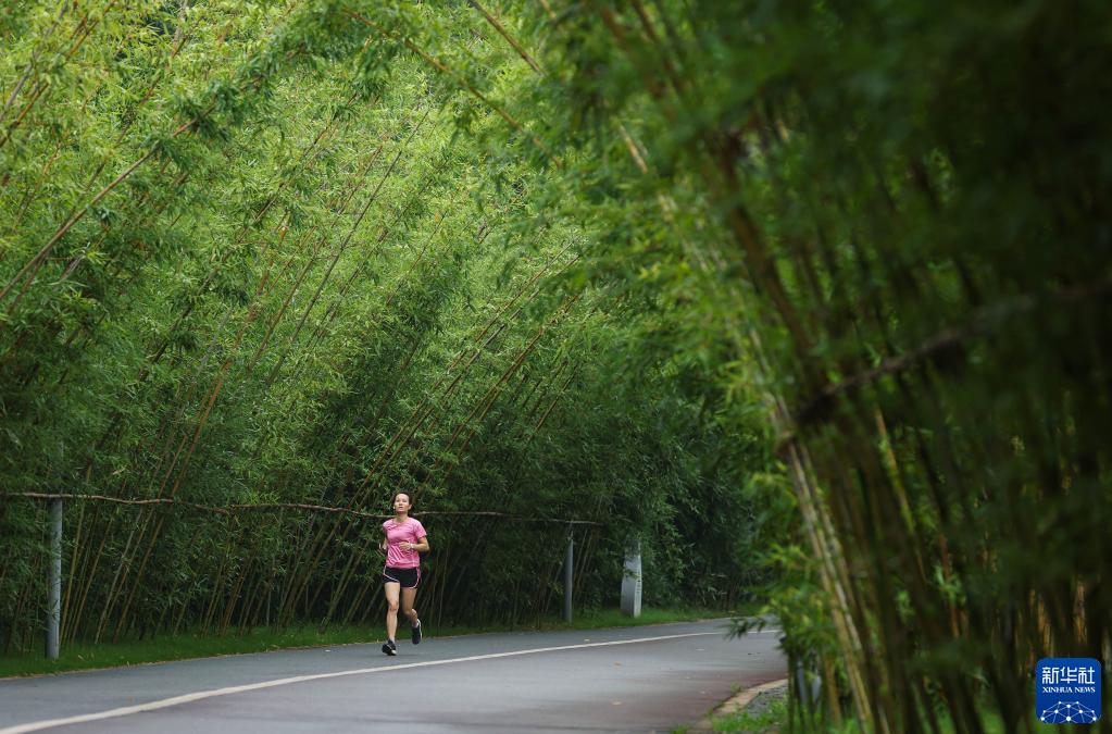 一位市民在四川省宜賓市江安縣長江竹島上跑步(6月30日攝)。