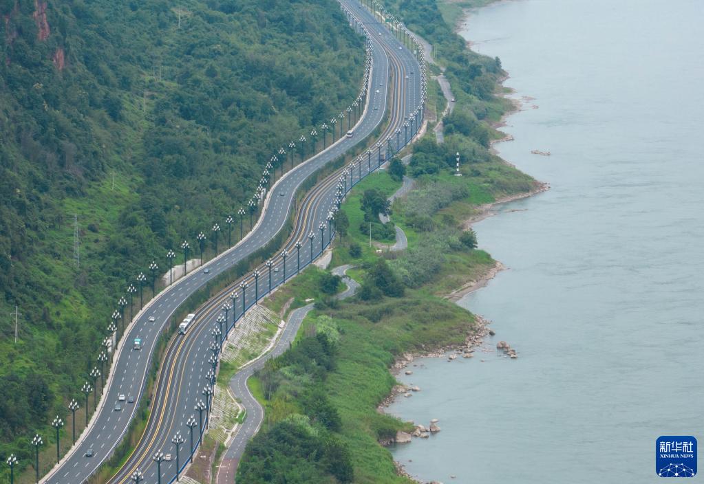 這是6月29日在四川省宜賓市拍攝的三江新區通往南溪區的智能軌道快運系統T4線,該線沿著長江邊運行(無人機照片)。