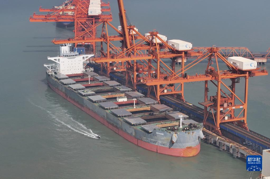 7月10日,一艘輪船靠泊在唐山港曹妃甸港區礦石碼頭卸載(無人機照片)。
