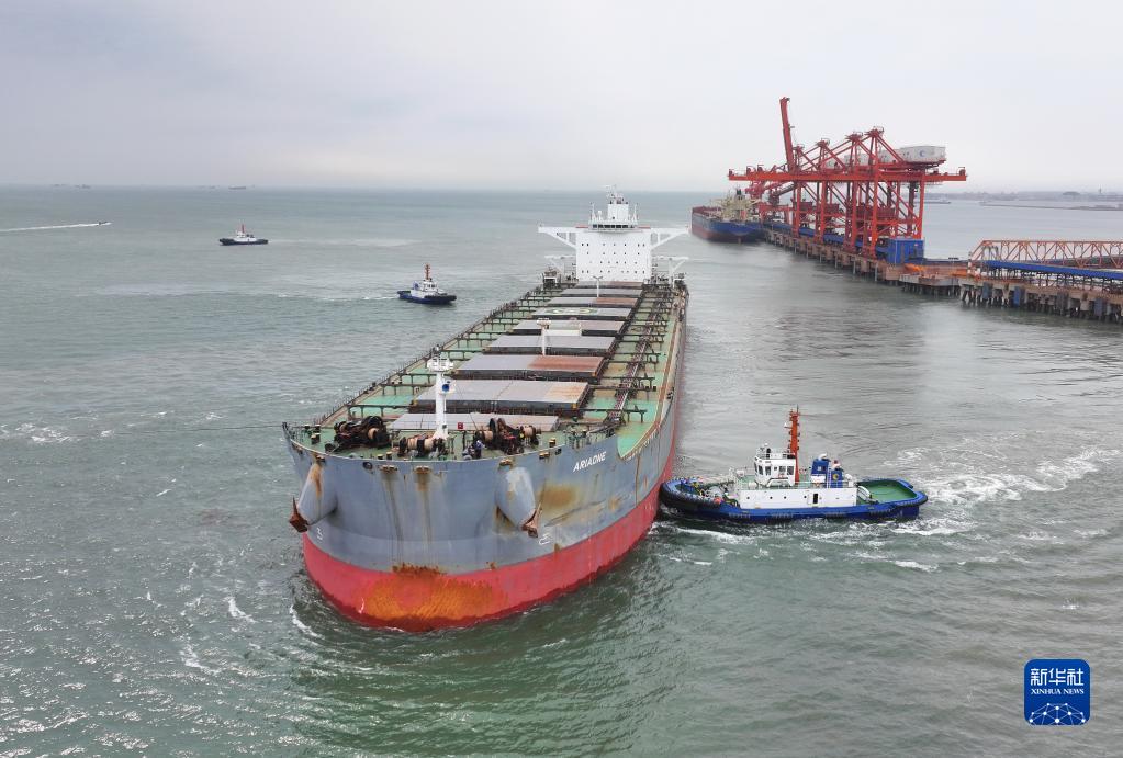 7月10日,一艘輪船在唐山港曹妃甸港區(qū)礦石碼頭卸載后在拖輪協(xié)助下離港(無人機(jī)照片)。