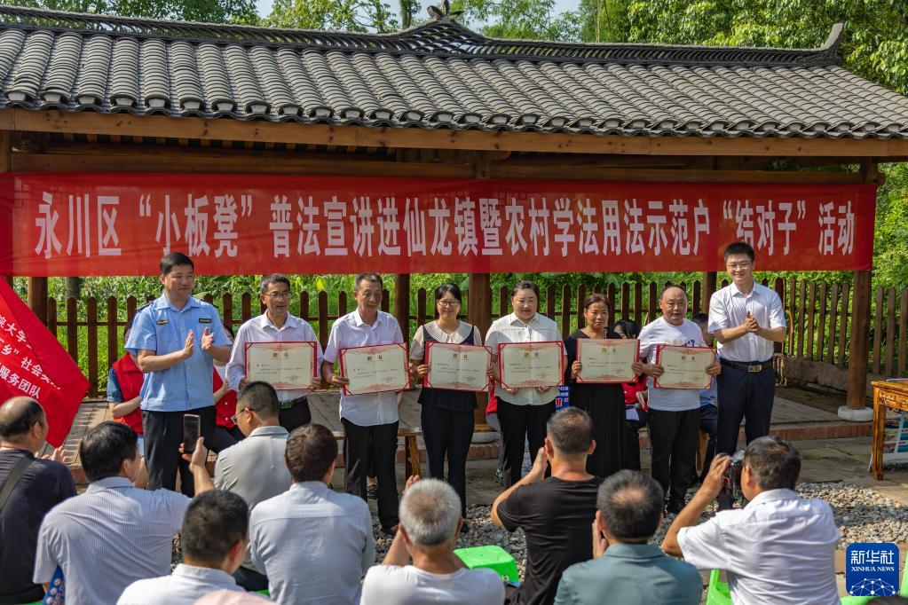 7月10日,在重慶市永川區仙龍鎮雙星村,工作人員為村內學法用法示范戶頒發“小板凳”宣講隊隊員聘書。