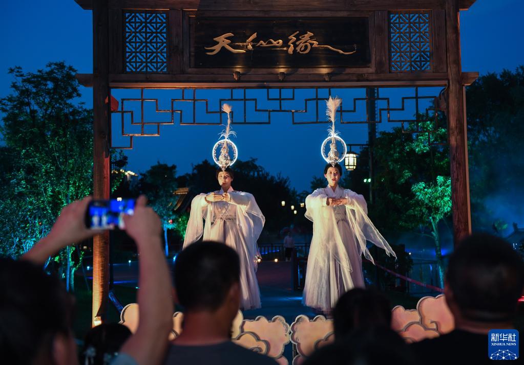 7月9日,在江蘇東臺西溪天仙緣景區,觀眾在觀看行進式夜間游園演出《尋仙緣》。