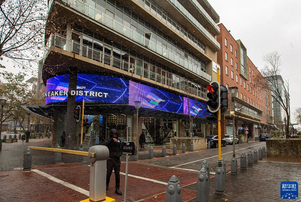 7月10日,在南非約翰內斯堡一處商業區,人們在雪中行走。