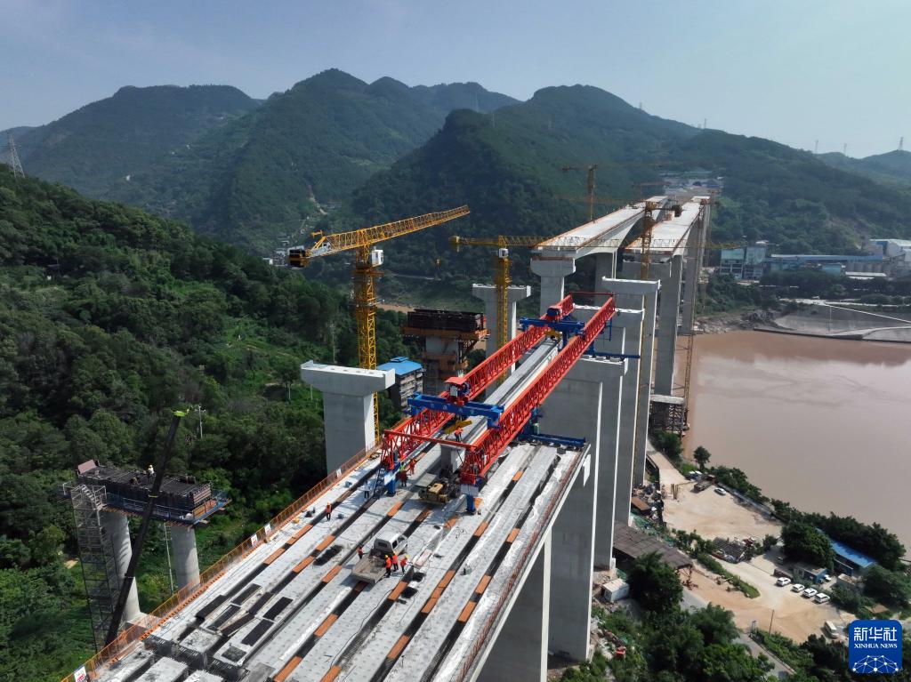 7月10日,施工人員在重慶市北碚區渝武高速復線觀音峽嘉陵江特大橋架設引橋T梁(無人機照片)。
