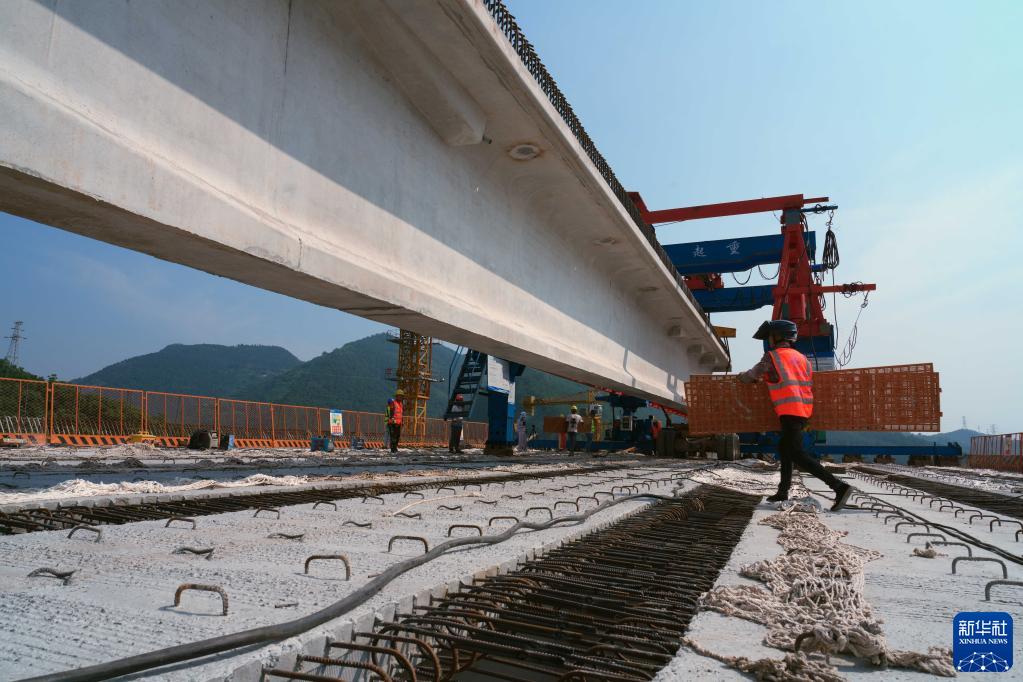 7月10日,施工人員在重慶市北碚區(qū)渝武高速?gòu)?fù)線觀音峽嘉陵江特大橋架設(shè)引橋T梁。
