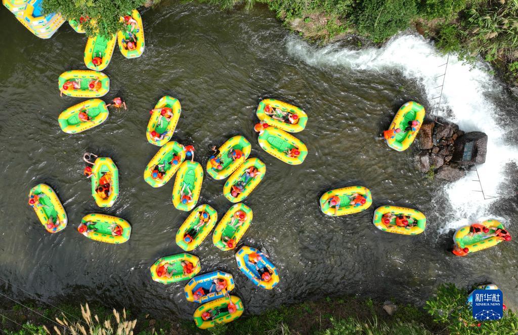 7月10日,湖南省衡陽市衡陽縣金蘭鎮聯龍村,游客在龍王峽漂流戲水(無人機照片)。
