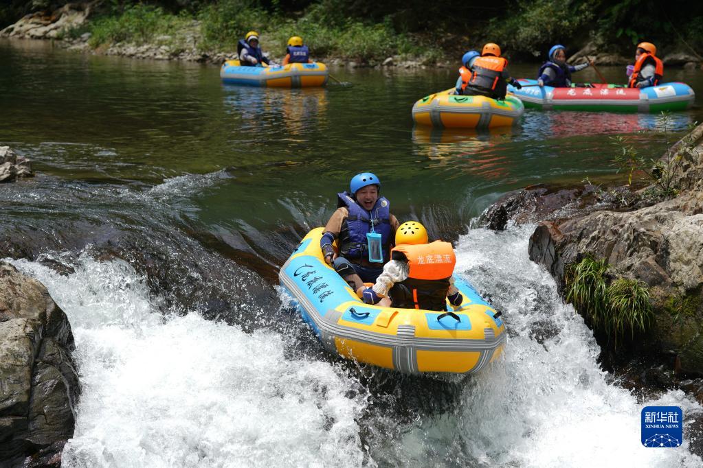 7月9日,游客在湖南省懷化市通道侗族自治縣龍底河漂流。