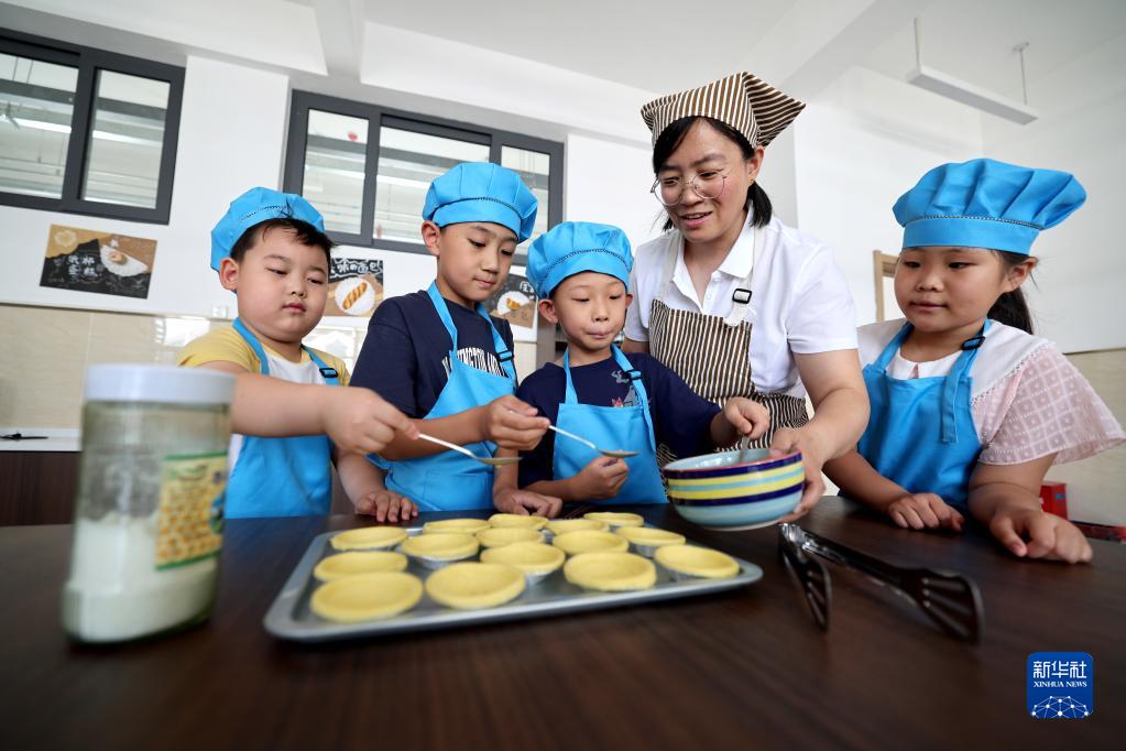 7月10日,在河北省石家莊市復興大街小學,小學生在老師的指導下進行面點制作。