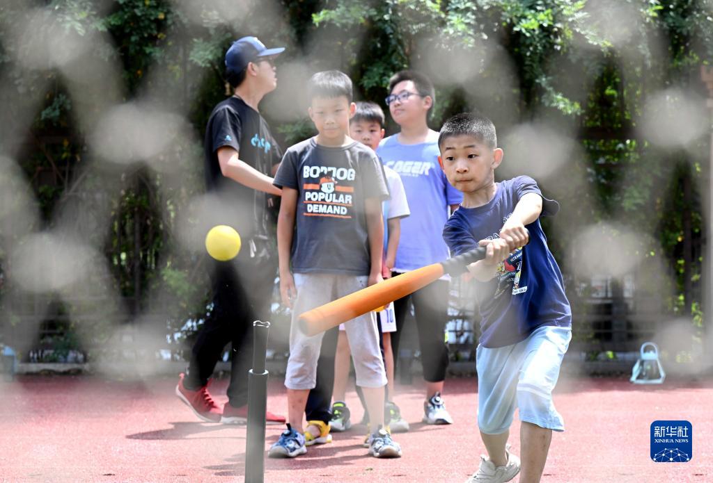 7月10日,學(xué)生在河北省石家莊市保利啟新小學(xué)暑期托管班練習(xí)軟式棒壘球。