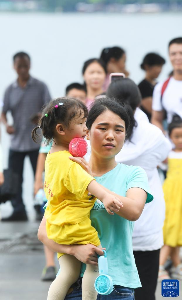 7月10日,在杭州西湖景區(qū),一位母親手持兩個風扇和女兒游玩。