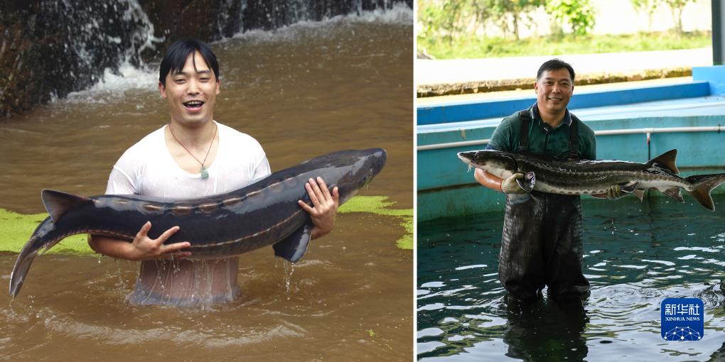 這是一張拼版照片:左圖為青年周亮與長江鱘(曾朗 攝);右圖為2023年6月27日拍攝的周亮與長江鱘(新華社記者 胥冰潔 攝)。