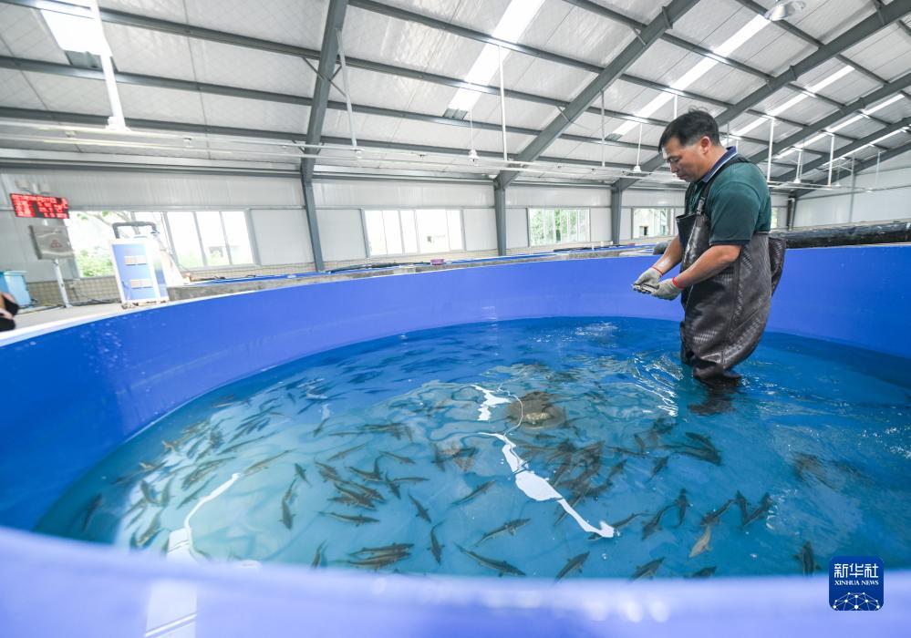 2023年6月27日,在宜賓珍稀水生動物研究所與四川省農(nóng)科院水產(chǎn)研究所合作的繁育基地,周亮查看長江鱘幼魚的生長情況。新華社記者 王曦 攝