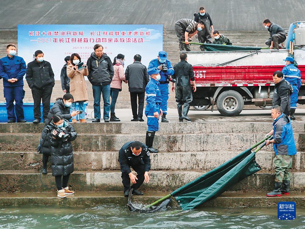 2021年1月21日,在四川省宜賓市,周亮(二排右一)參加長江鱘親本放流活動。新華社發