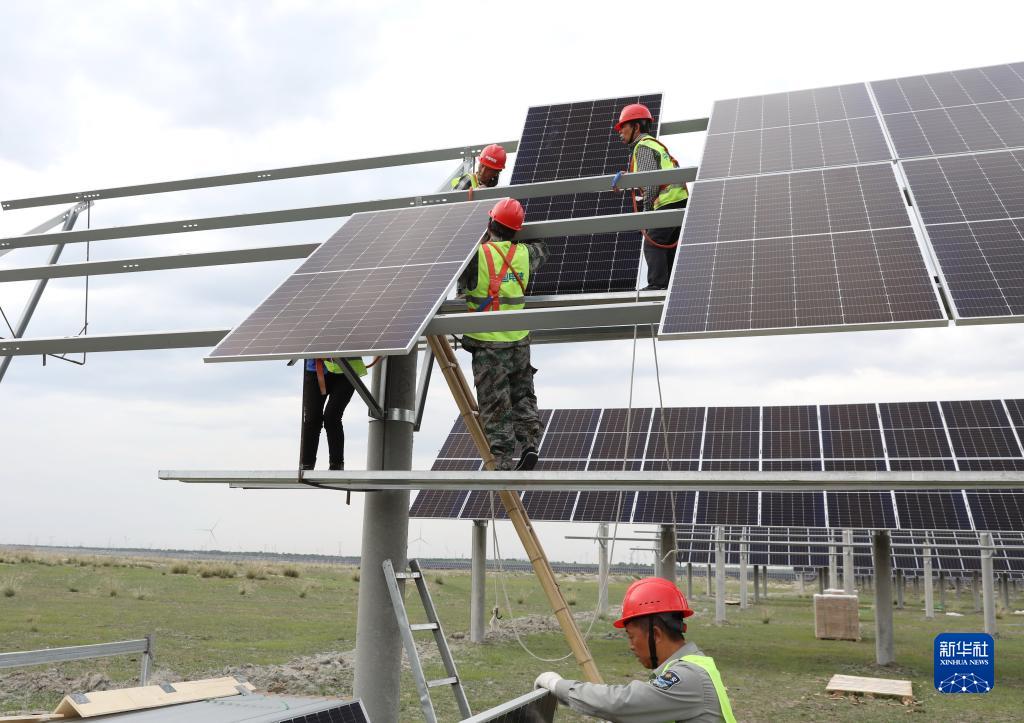 7月11日,在張家口市康保縣張紀(jì)鎮(zhèn),工人在一處光伏發(fā)電場建設(shè)工地施工。