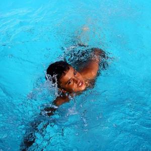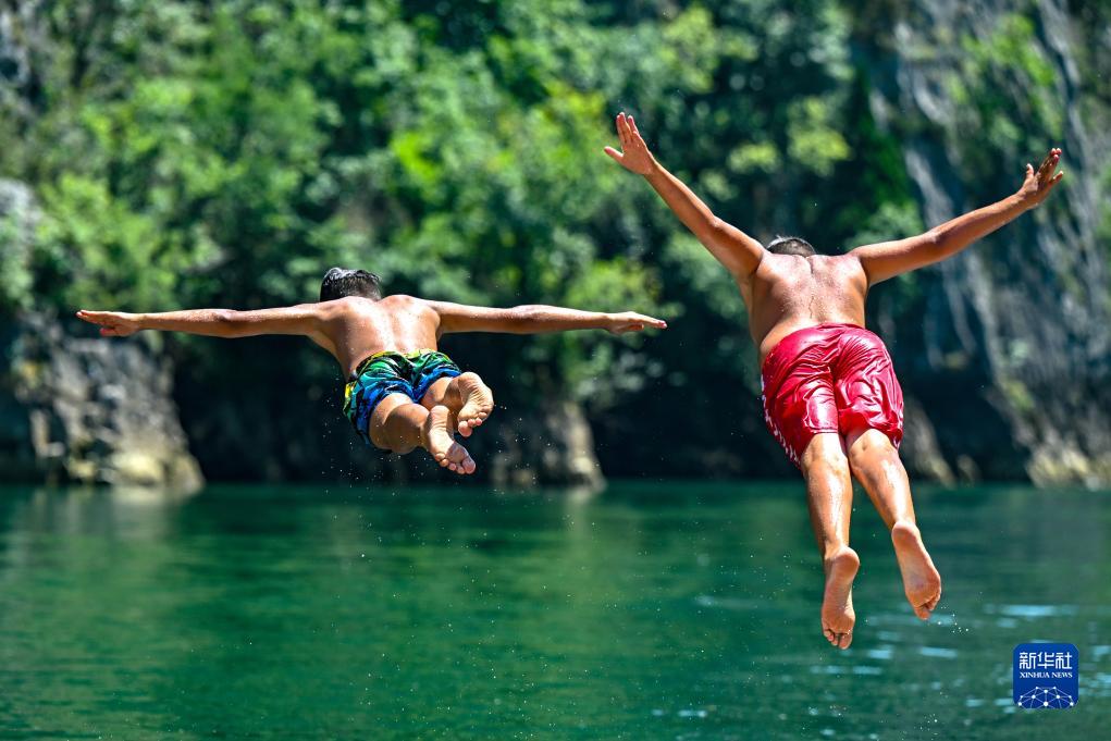 7月12日,在北馬其頓斯科普里附近的特雷斯卡河,人們跳水納涼。