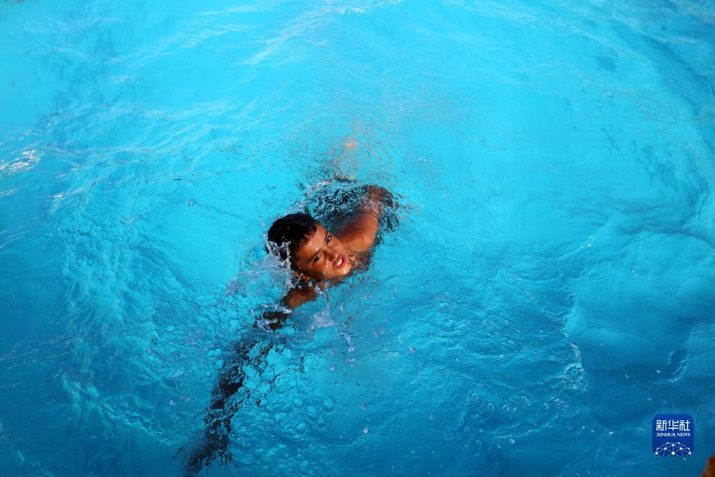7月12日,在約旦扎爾卡,一名男孩在泳池中游泳。