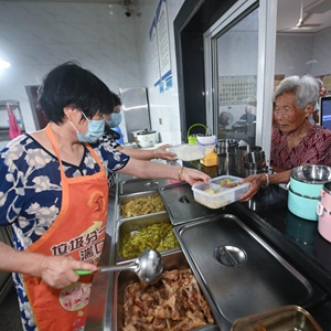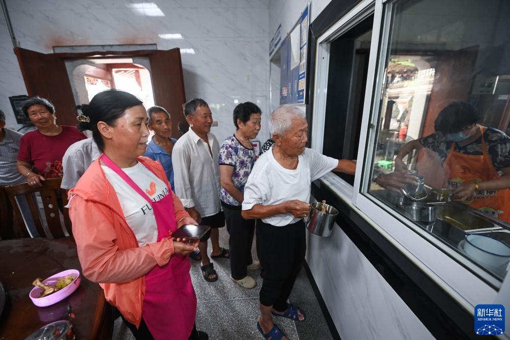 7月13日,老人們在湍口鎮迎豐村老年食堂打飯。這個老年食堂的建設得益于新鄉賢們的捐贈相助。