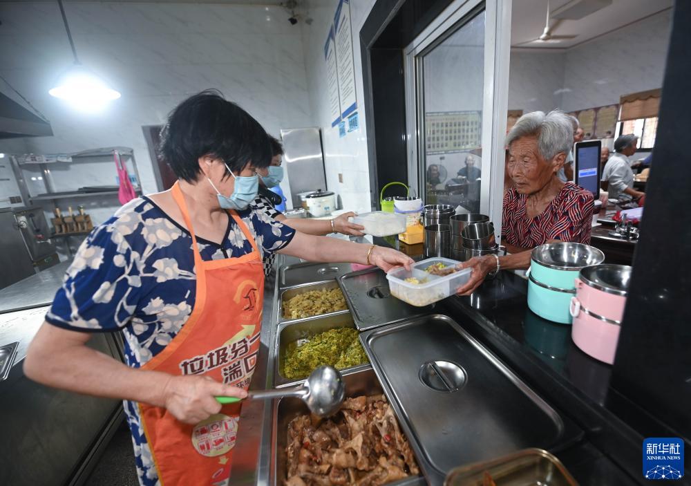 7月13日,老人們?cè)谕目阪?zhèn)迎豐村老年食堂打飯。該老年食堂的建設(shè)得益于新鄉(xiāng)賢們的捐贈(zèng)相助。