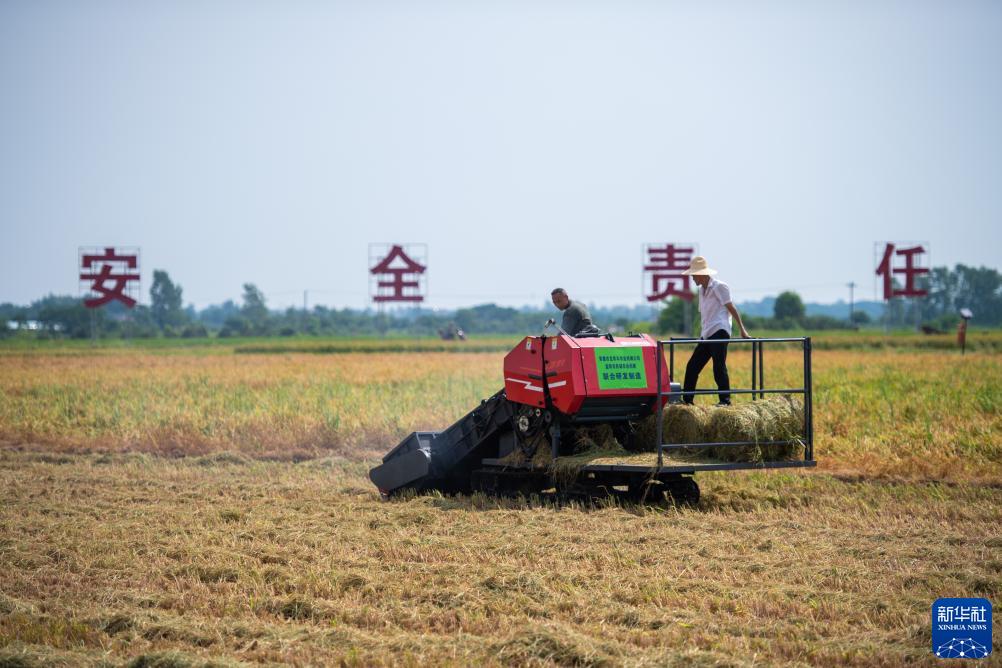 7月13日,在巖汪湖鎮武竺山村,農民駕駛秸稈打捆機回收水稻秸稈。