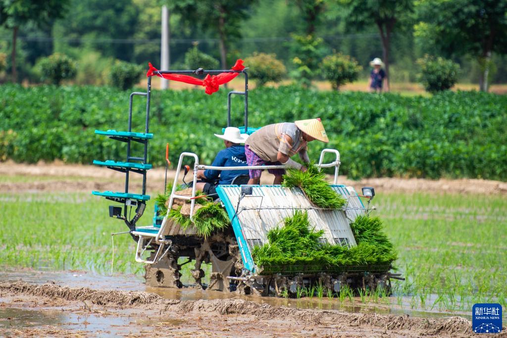7月13日,在巖汪湖鎮(zhèn)武竺山村,農(nóng)民駕駛插秧機進行水稻插秧作業(yè)。