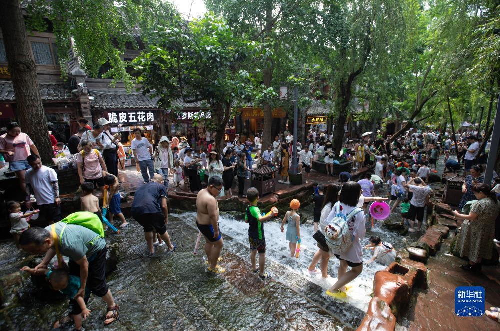 黃龍溪古鎮(zhèn)的水景觀成為孩子們親水避暑的樂園(6月24日攝)。作為國家4A級(jí)旅游景區(qū),黃龍溪古鎮(zhèn)臨水而興,黃龍溪親水是不少成都市民在節(jié)假日青睞的游玩方式。2016年,黃龍溪斷面水質(zhì)是劣Ⅴ類,如今,已經(jīng)達(dá)到了Ⅲ類。新華社記者 江宏景攝