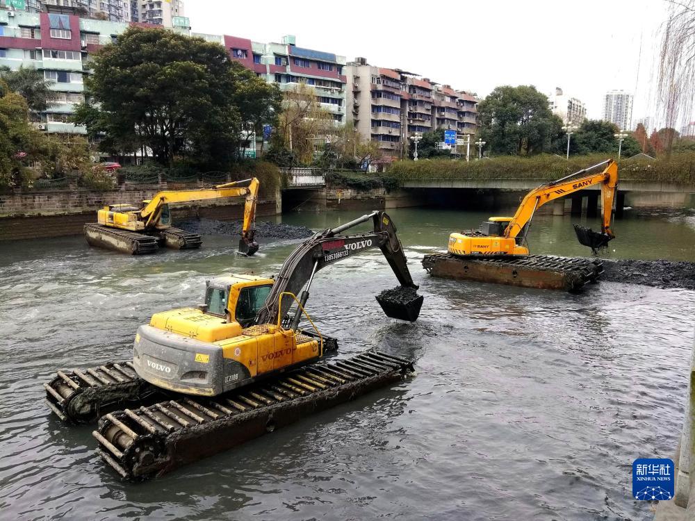 挖掘機在錦江支流府河里清淤疏浚河道(2018年1月25日攝)。新華社發(曹宗銘攝)