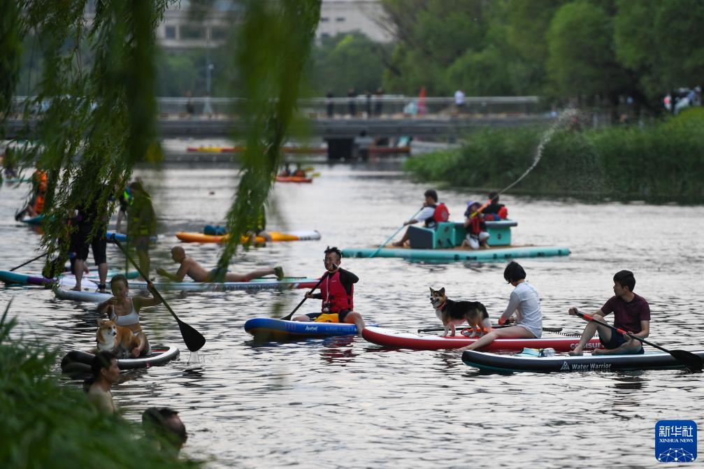 這是人們在北京亮馬河上劃槳板(6月23日攝)。