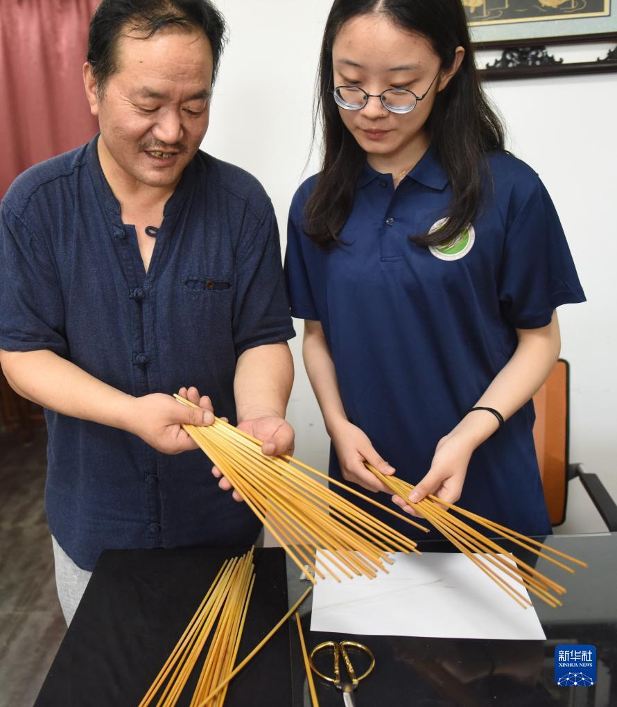 7月12日,吳永龍向學生教授選擇粗壯、圓挺、筆直、色勻的麥稈。新華社記者 黃曉勇 攝