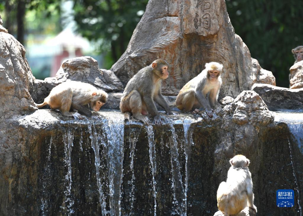 7月13日,幾只獼猴在廣西南寧市動(dòng)物園戲水消暑降溫。